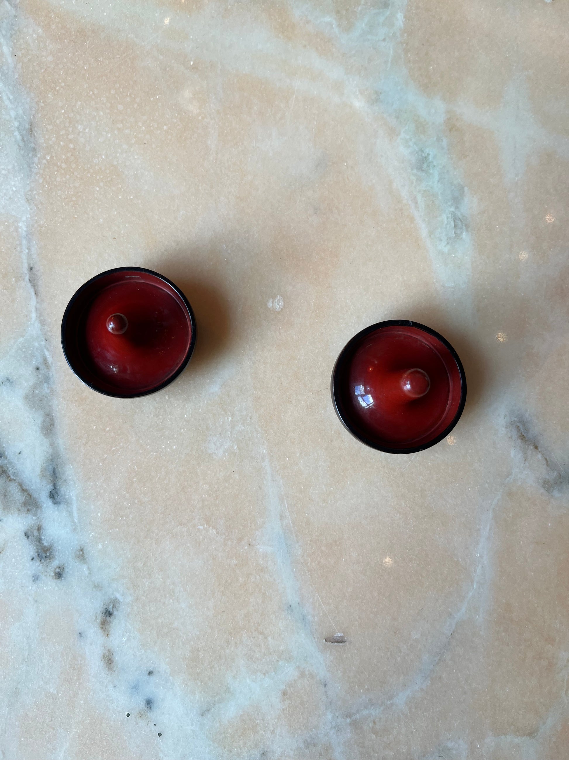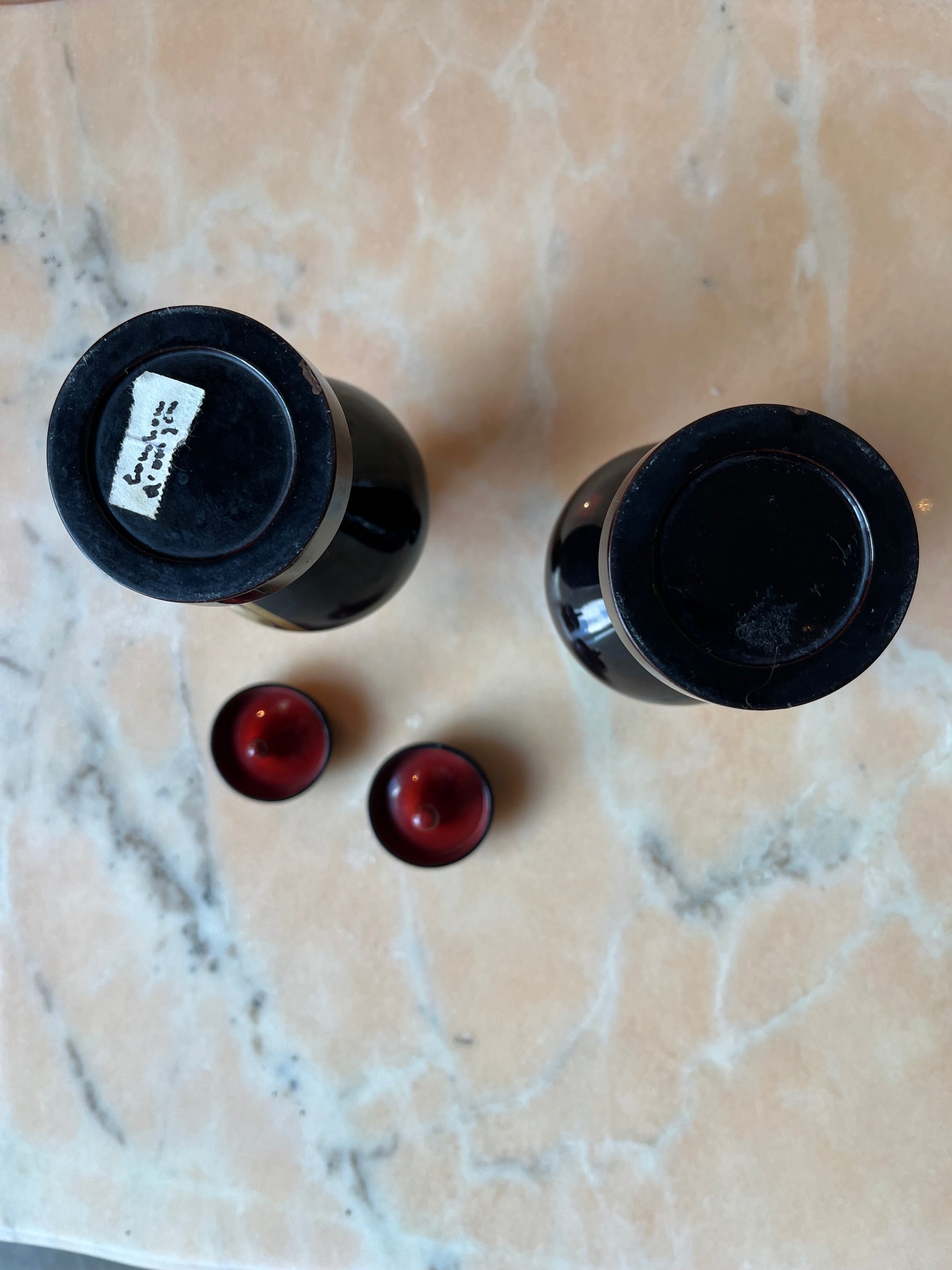 Paire de bouteilles à saké japonaise en laque noire, décorés d'un mon doré stylisé.