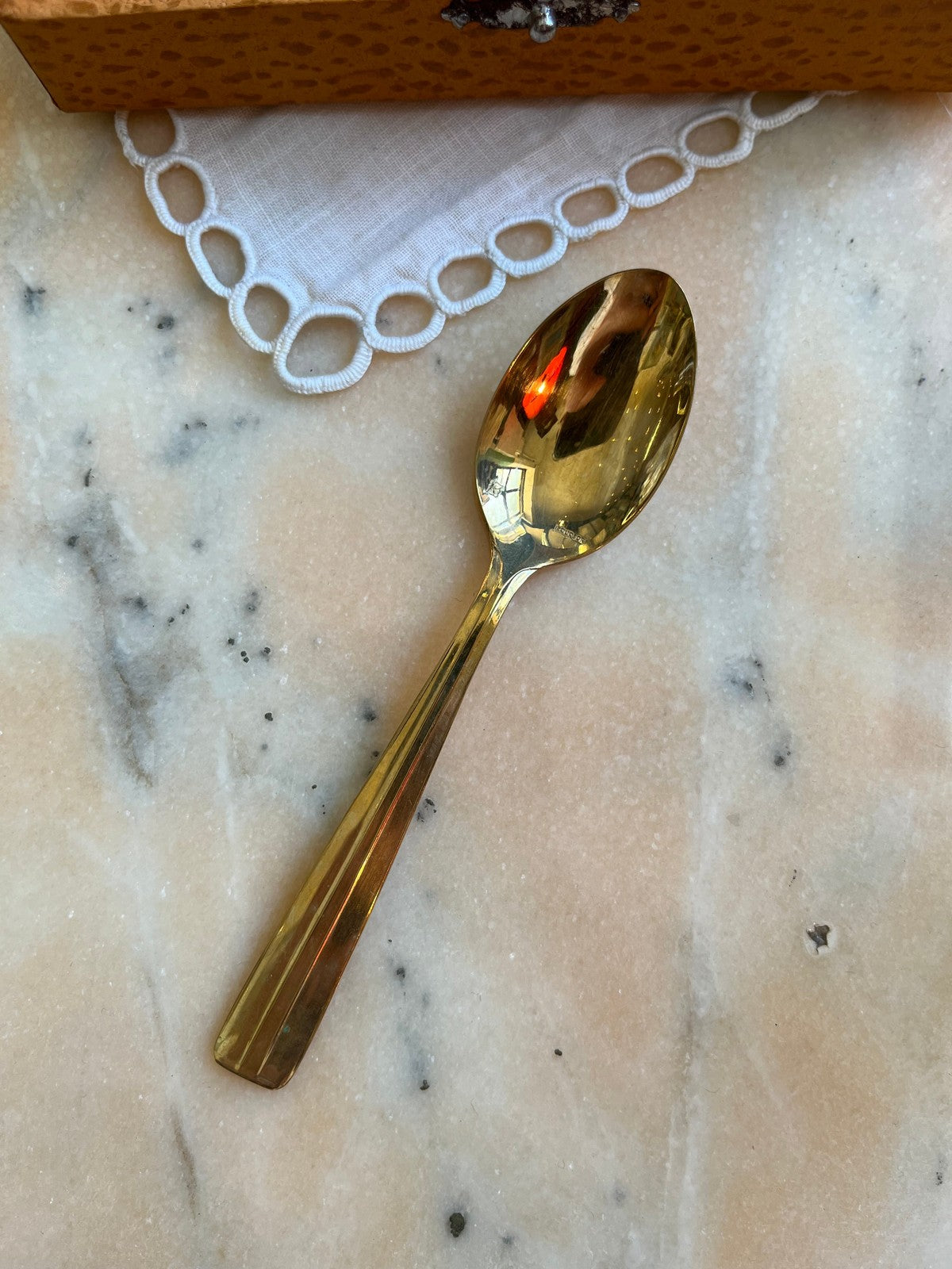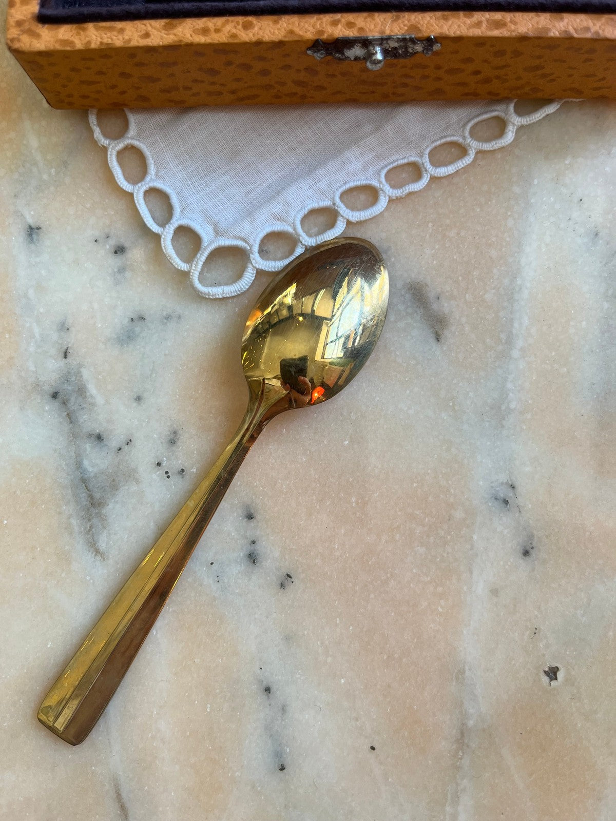 Lot de 12 petites cuillères dorées Louqsor dans son ecrin.