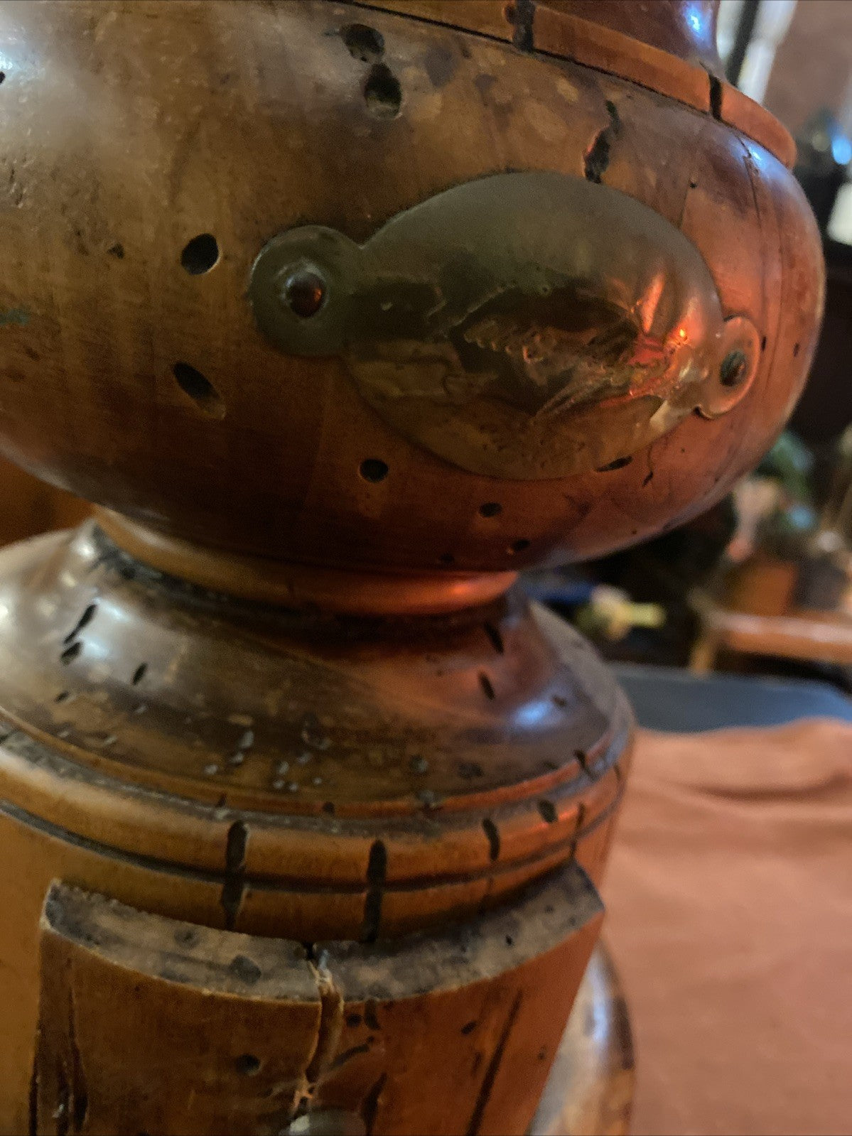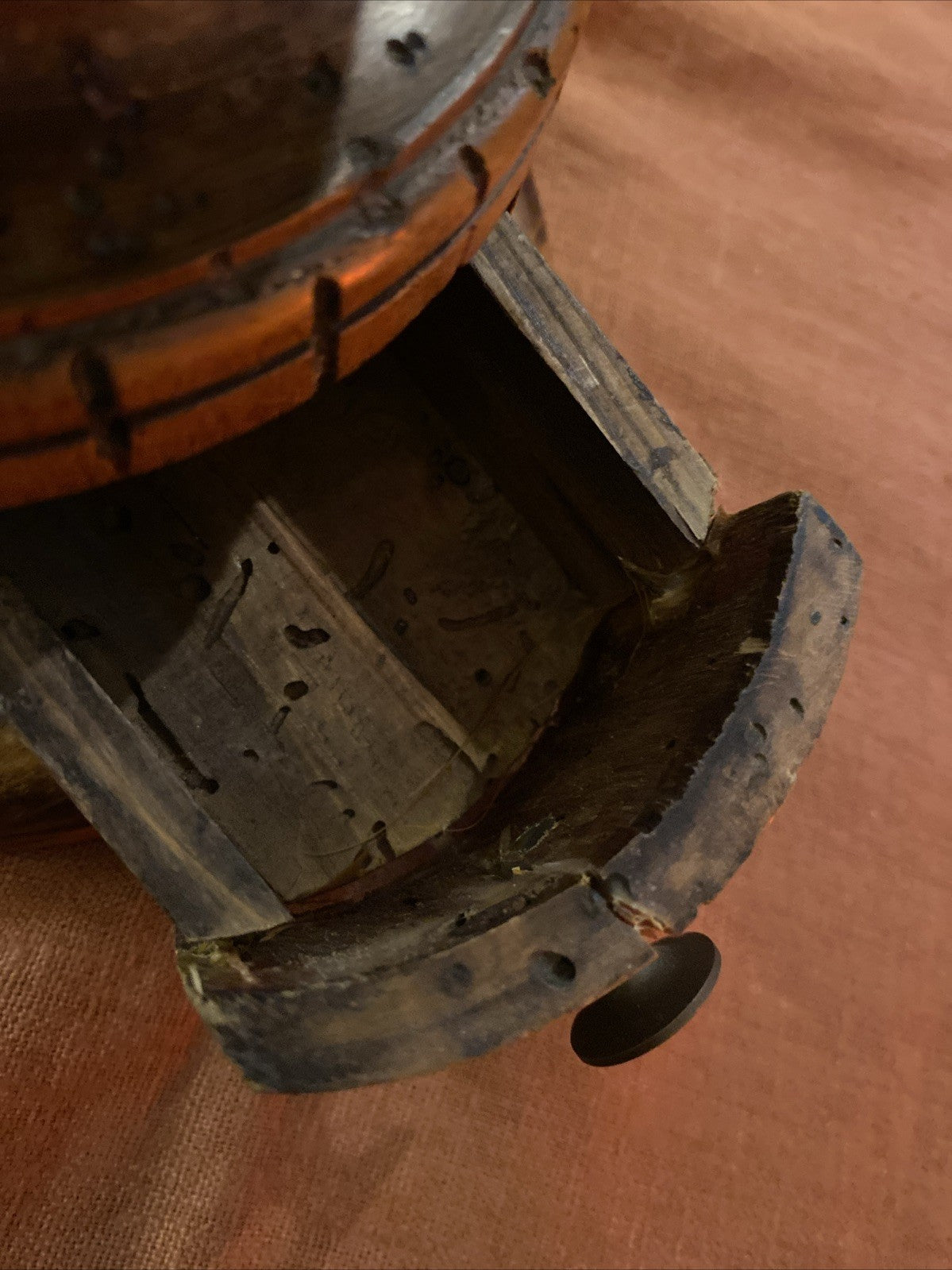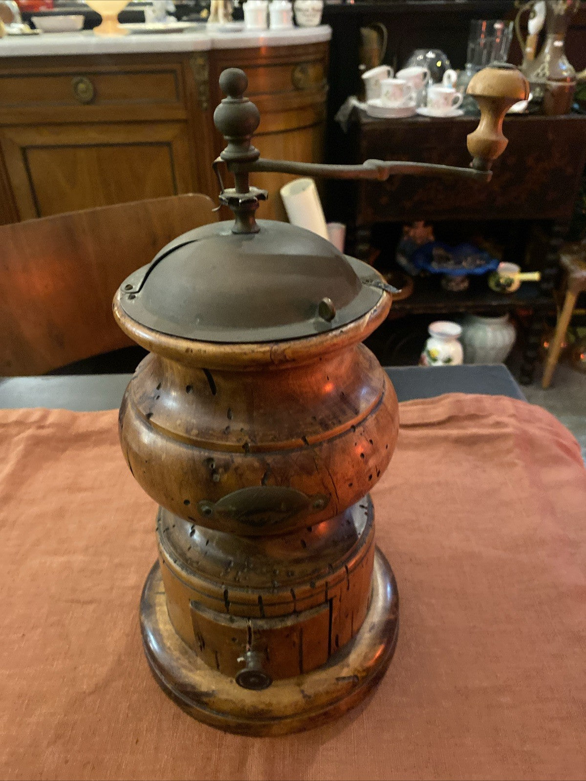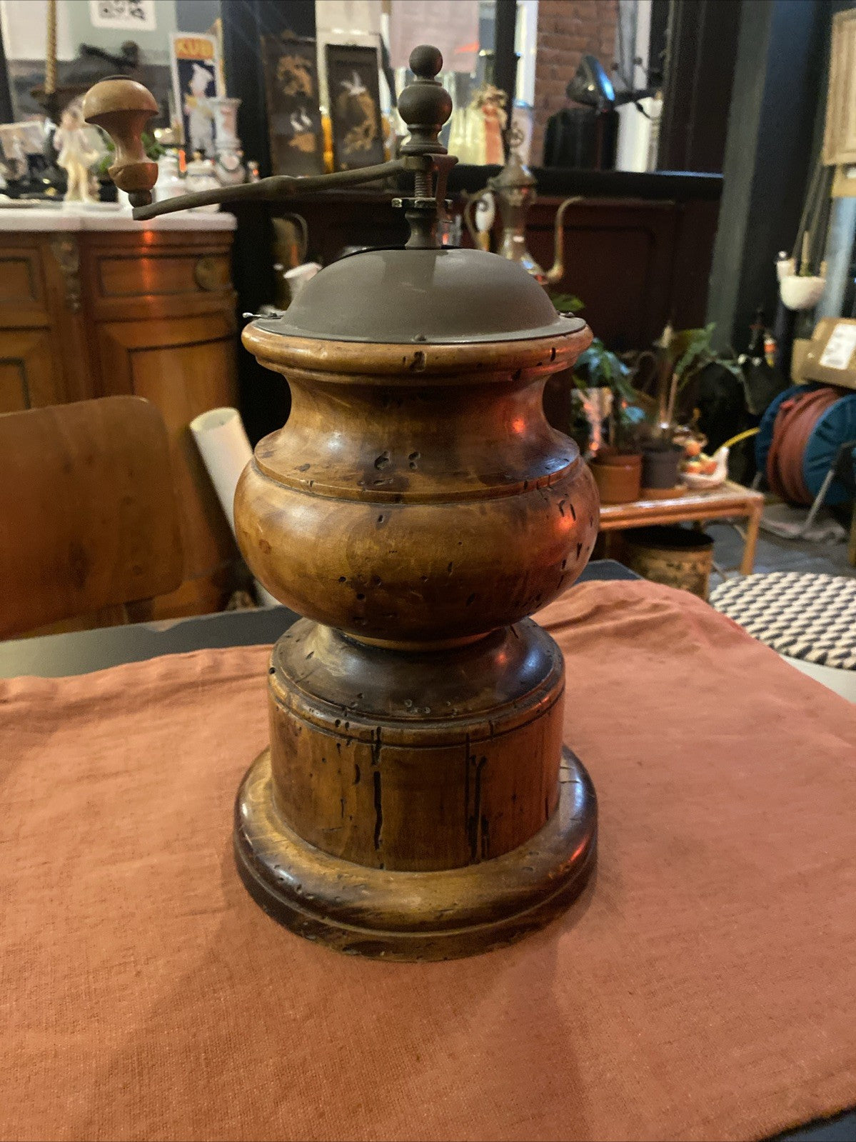Moulin à café italien Stefano Ugolini - Firenze, vers 1950-1970, en bois tourné massif et couvercle en métal patiné, manivelle en laiton, fabrication artisanale toscane. Hauteur 34 cm